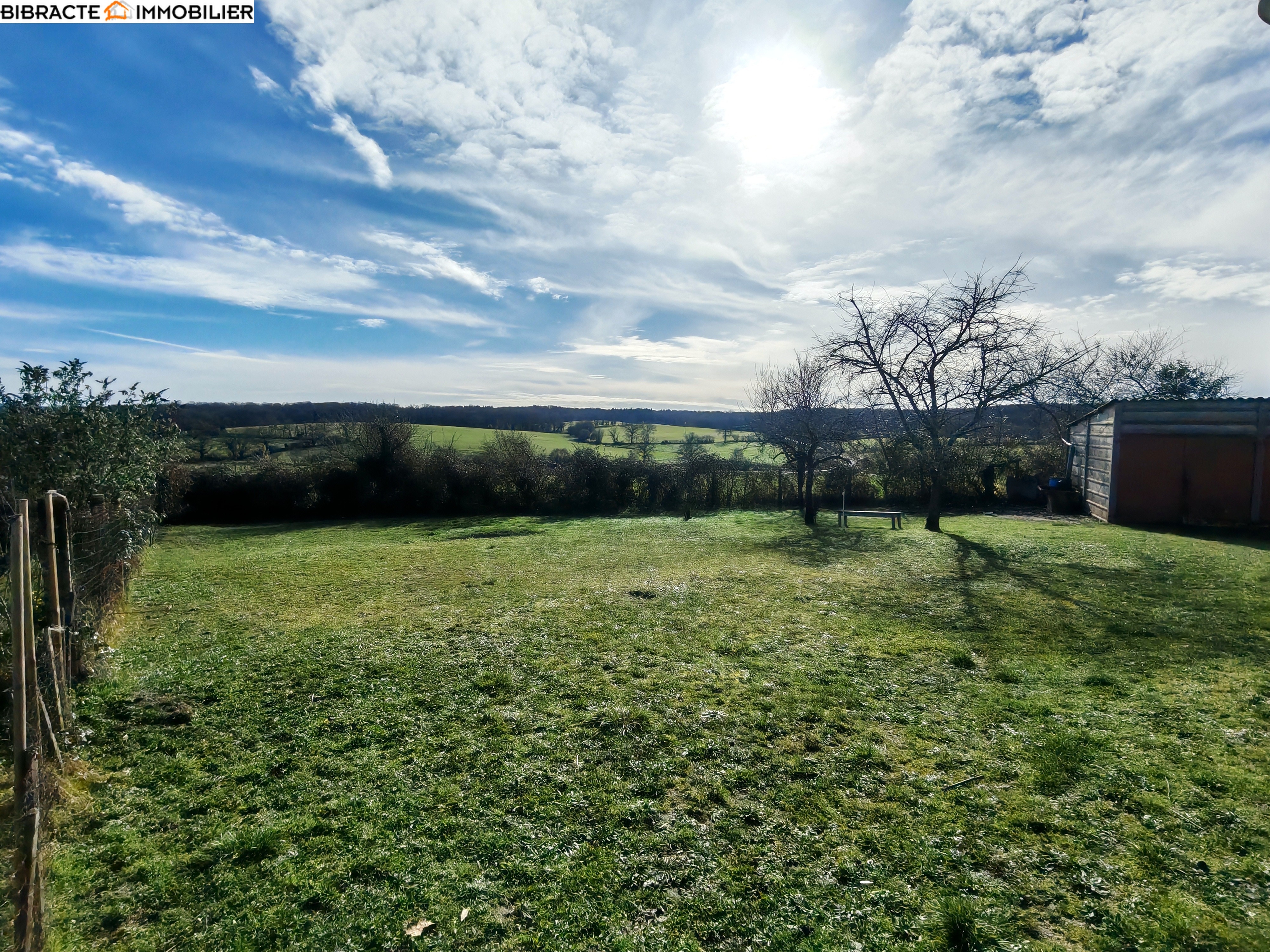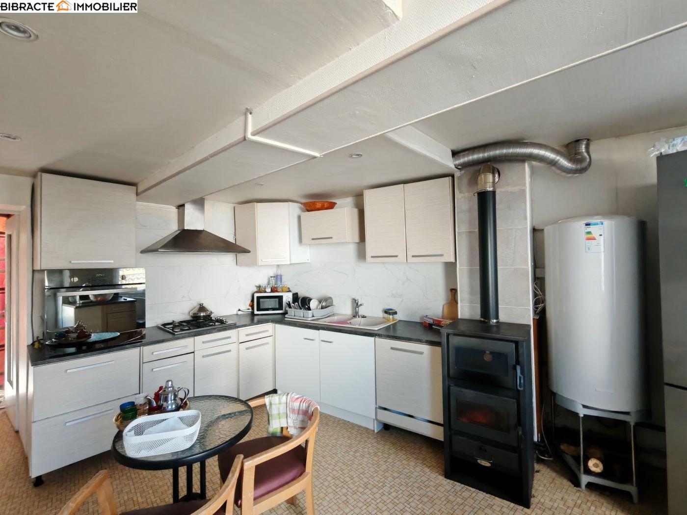 Elle offre une cuisine chaleureuse avec poêle à bois, un séjour lumineux de 35 m² agrémenté d’un insert bois, deux chambres, une salle de bains ainsi que des WC séparés.