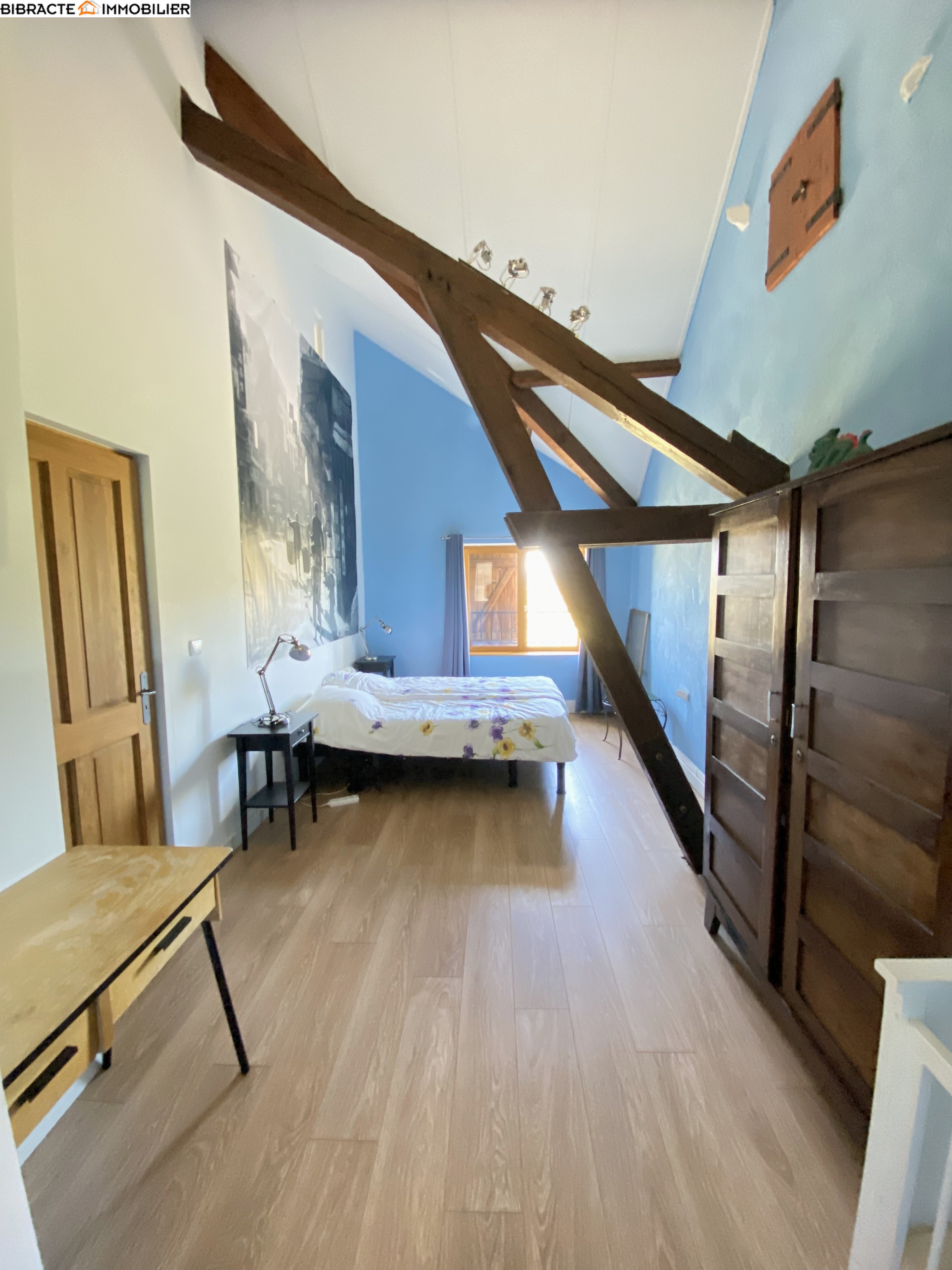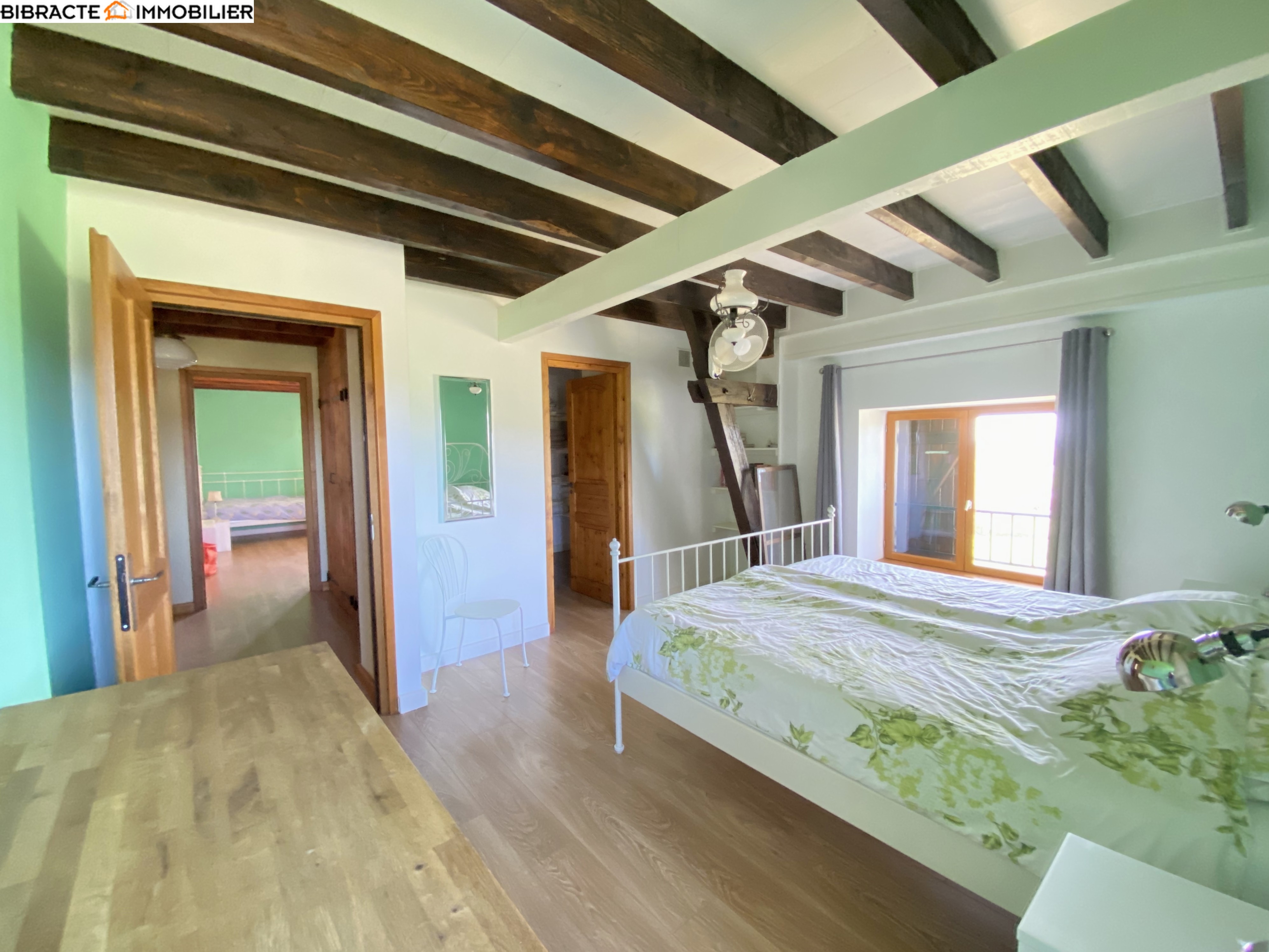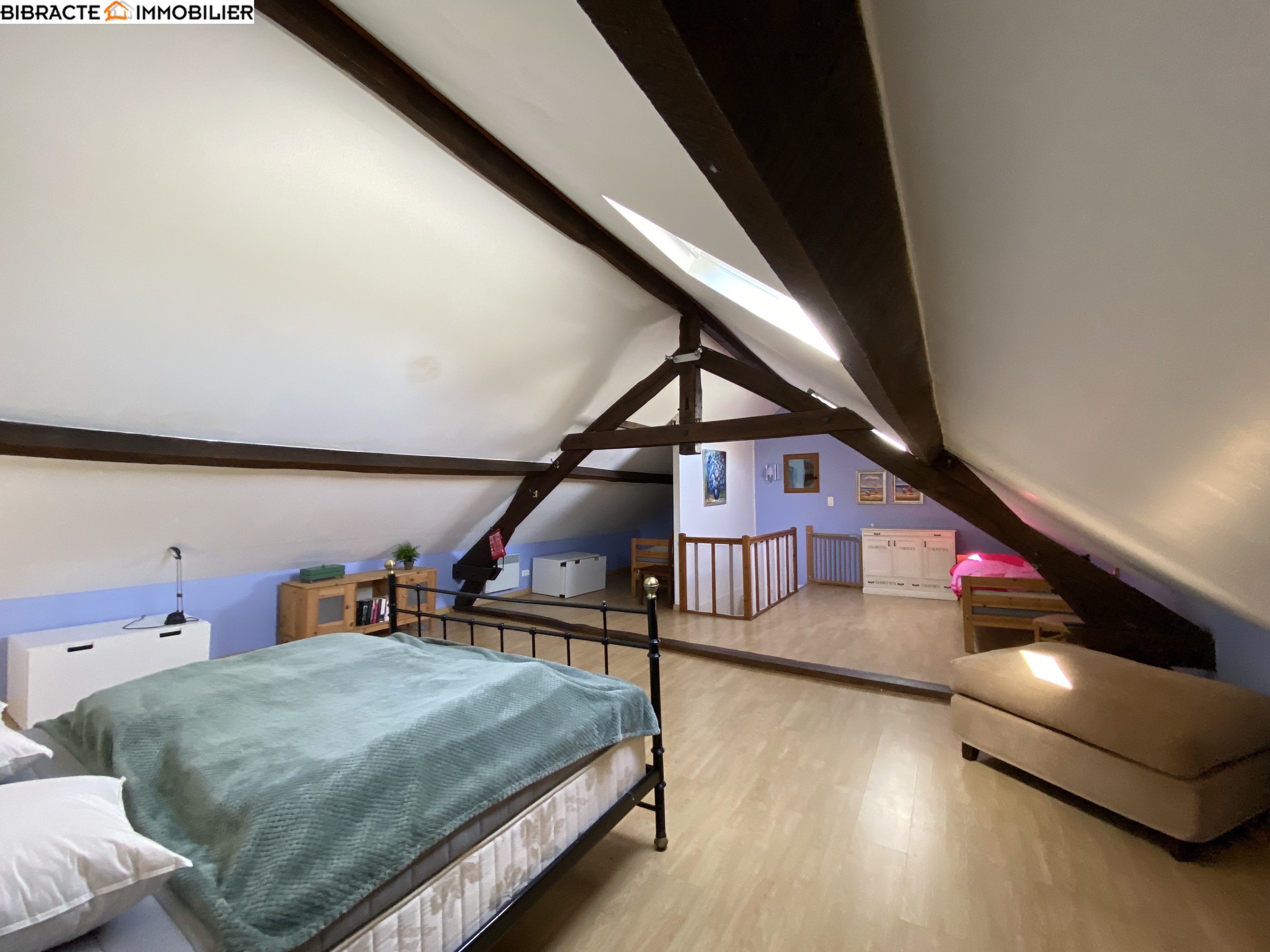 La grande maison (surface habitable d'environ 215 m²) a été reconstruite selon une charpente à l'intérieur de l'ancienne grange. De ce fait, ses murs sont particulièrement épais et à double paroi. Le hall d'entrée dessert une première salle de bains avec douche, WC et chauffage au sol. Le spacieux séjour s'ouvre sur une terrasse offrant une vue magnifique. La belle cuisine, qui comprend également un cellier, donne sur une salle à manger avec chauffage au sol. Ici se trouve une seconde terrasse. A l'étage, un palier dessert trois chambres et une salle de bains avec douche, baignoire et WC. Au deuxième étage, une pièce spacieuse a été aménagée en chambre/dortoir. Une cour intérieure fait office d'espace de détente.
