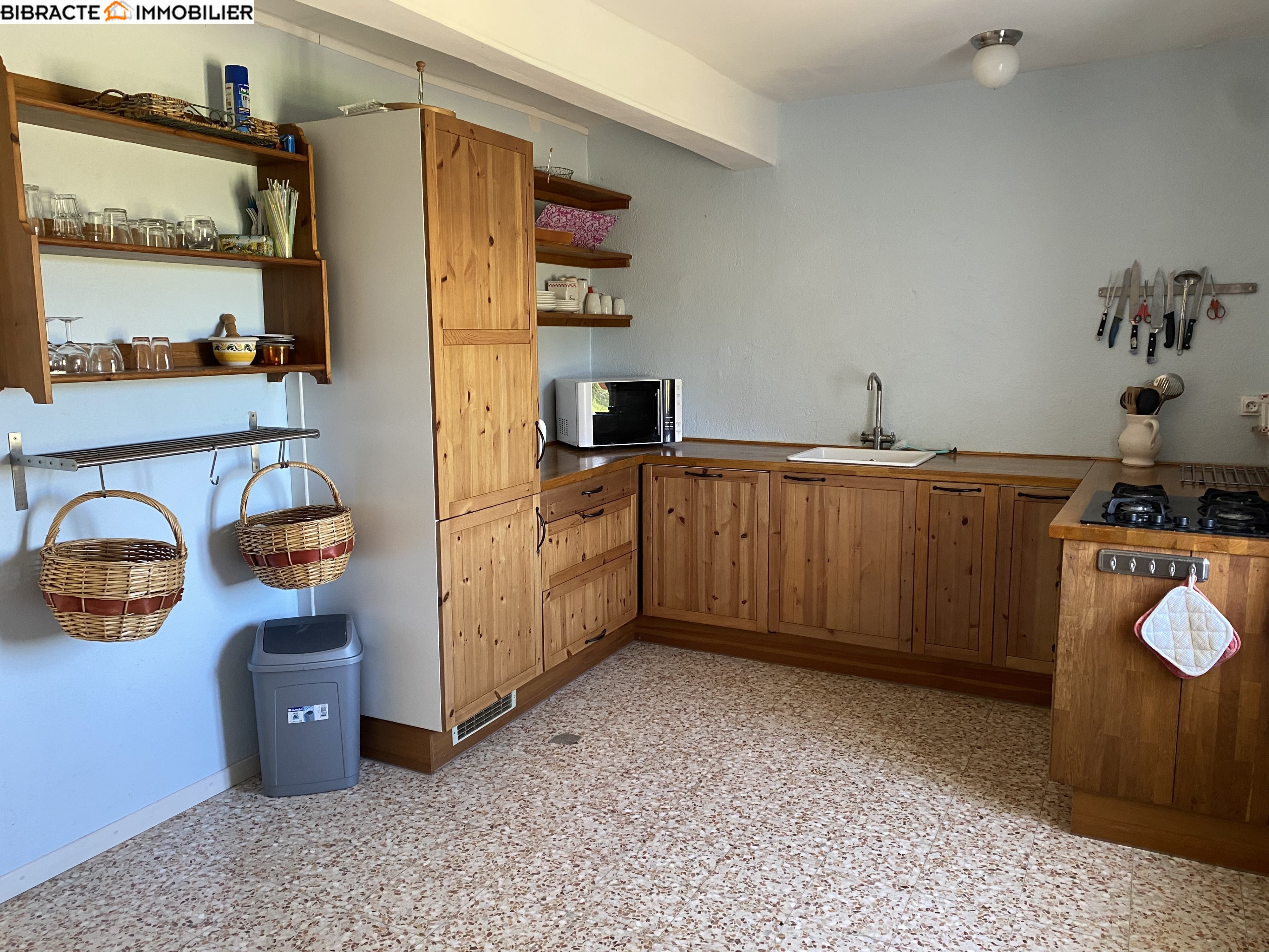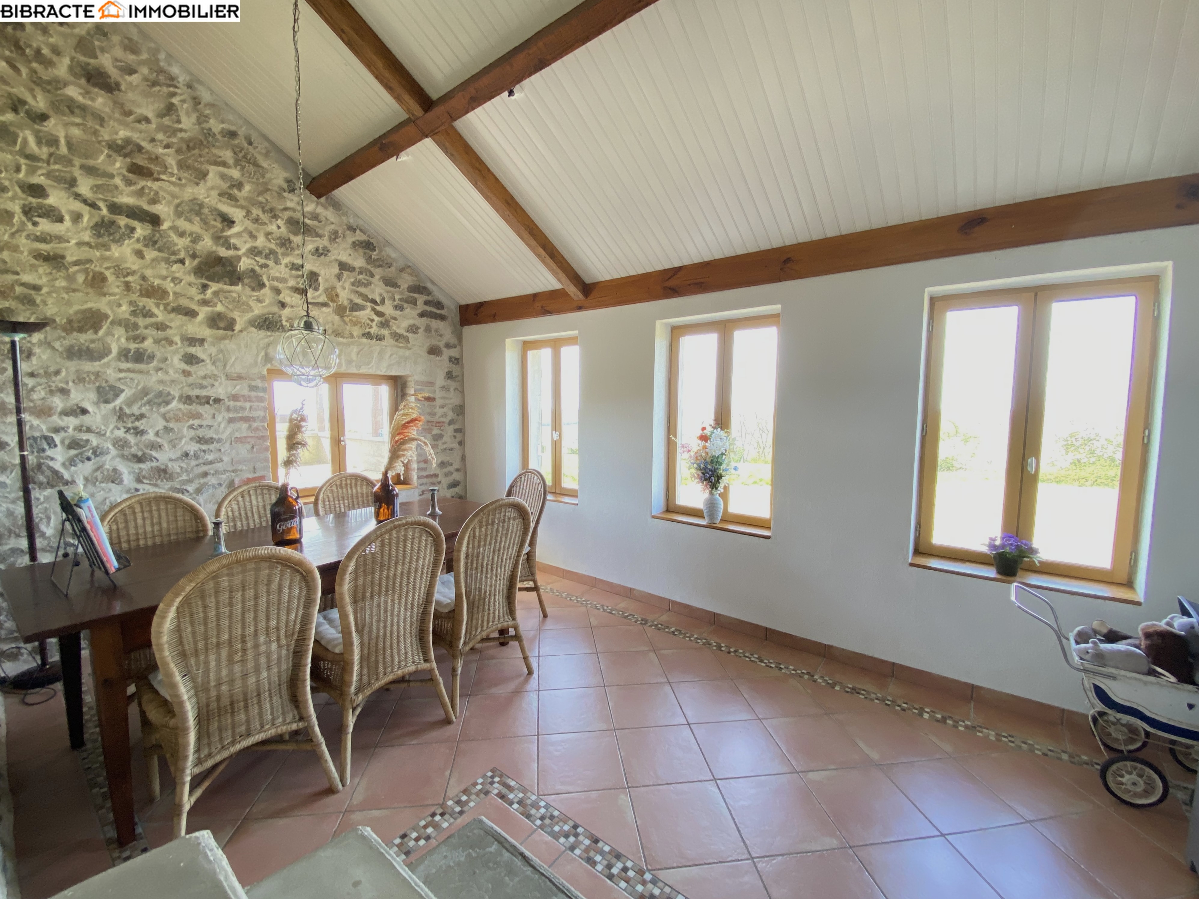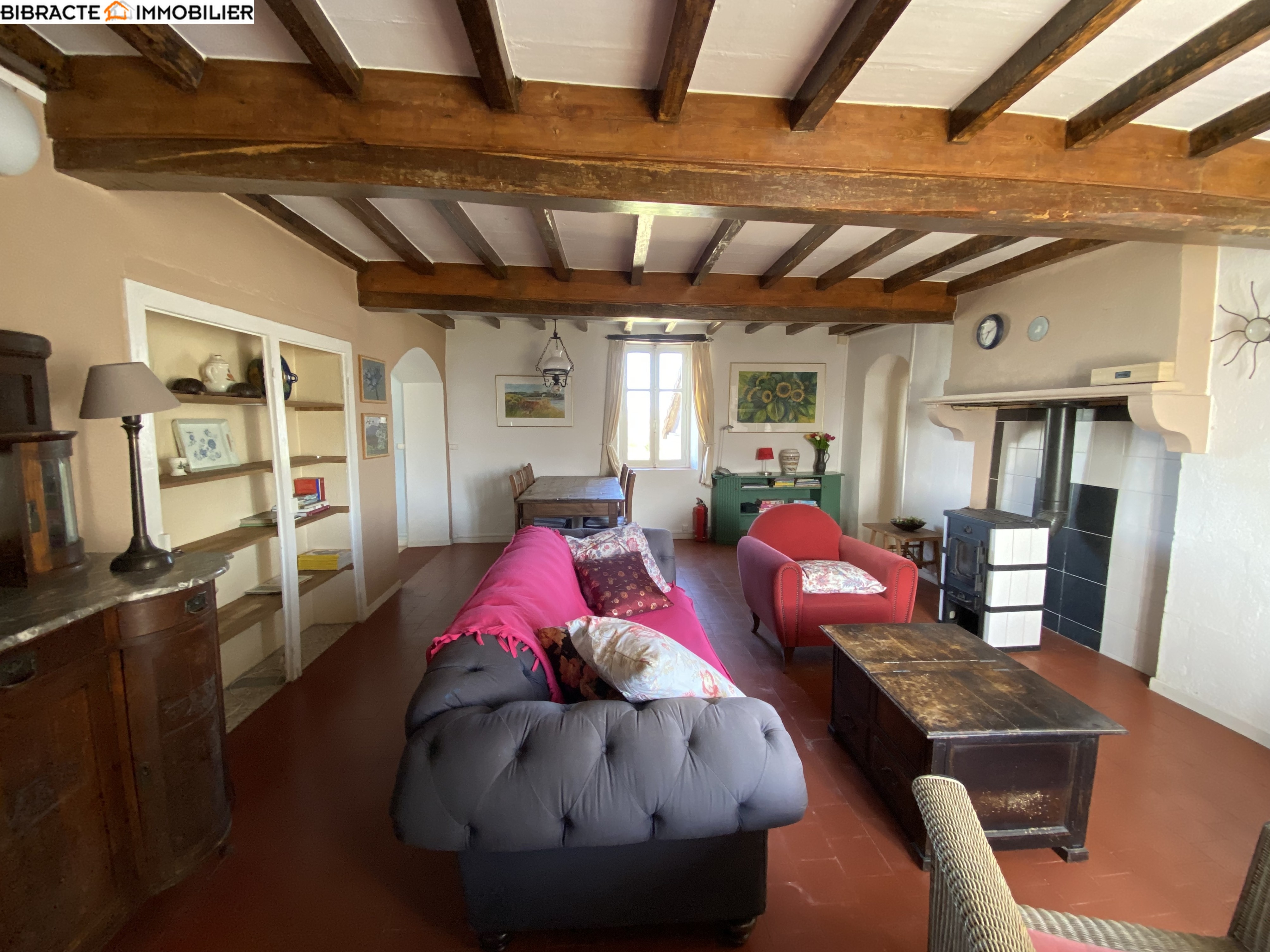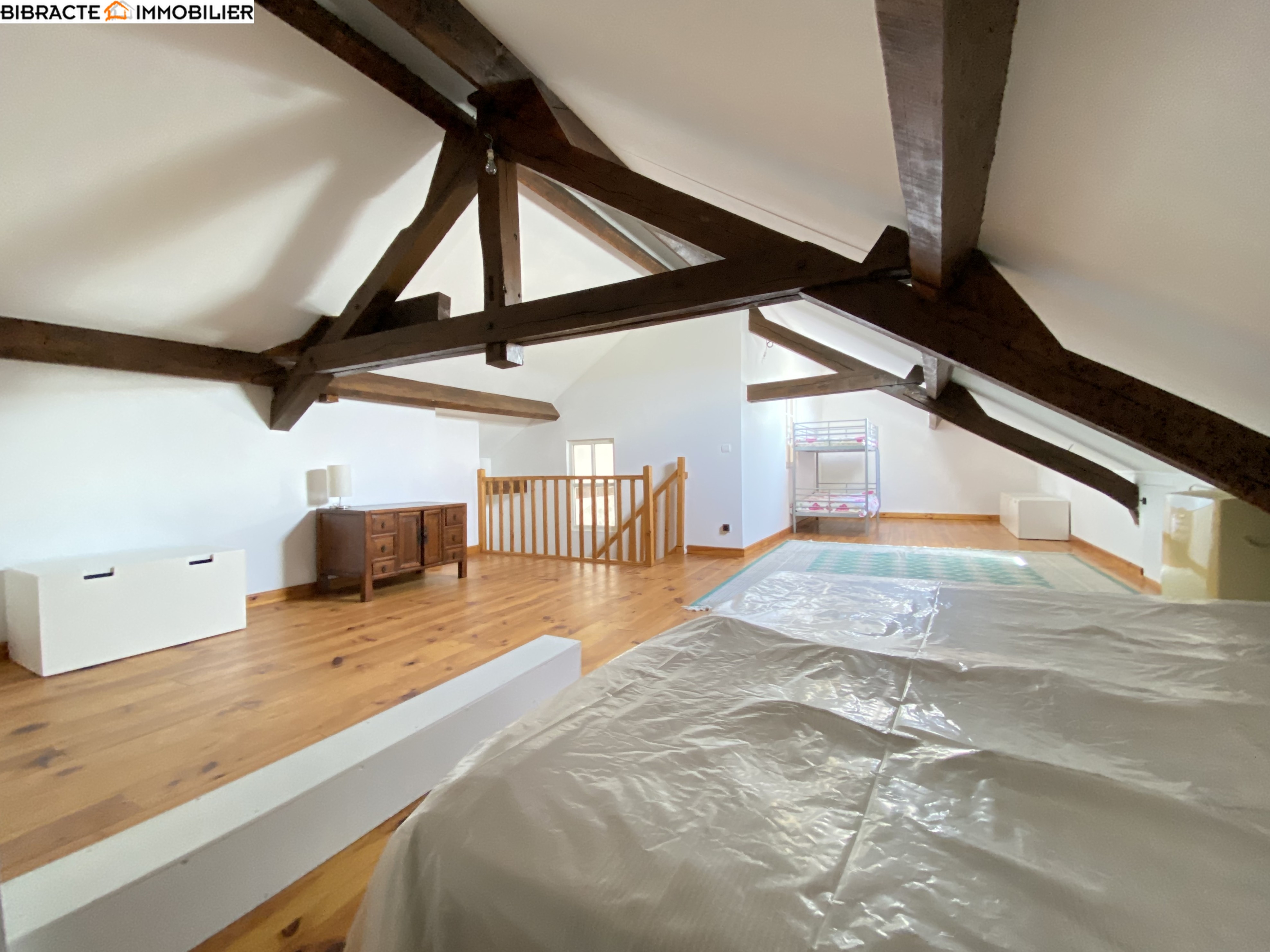 La grande maison (surface habitable d'environ 215 m²) a été reconstruite selon une charpente à l'intérieur de l'ancienne grange. De ce fait, ses murs sont particulièrement épais et à double paroi. Le hall d'entrée dessert une première salle de bains avec douche, WC et chauffage au sol. Le spacieux séjour s'ouvre sur une terrasse offrant une vue magnifique. La belle cuisine, qui comprend également un cellier, donne sur une salle à manger avec chauffage au sol. Ici se trouve une seconde terrasse. A l'étage, un palier dessert trois chambres et une salle de bains avec douche, baignoire et WC. Au deuxième étage, une pièce spacieuse a été aménagée en chambre/dortoir. Une cour intérieure fait office d'espace de détente.