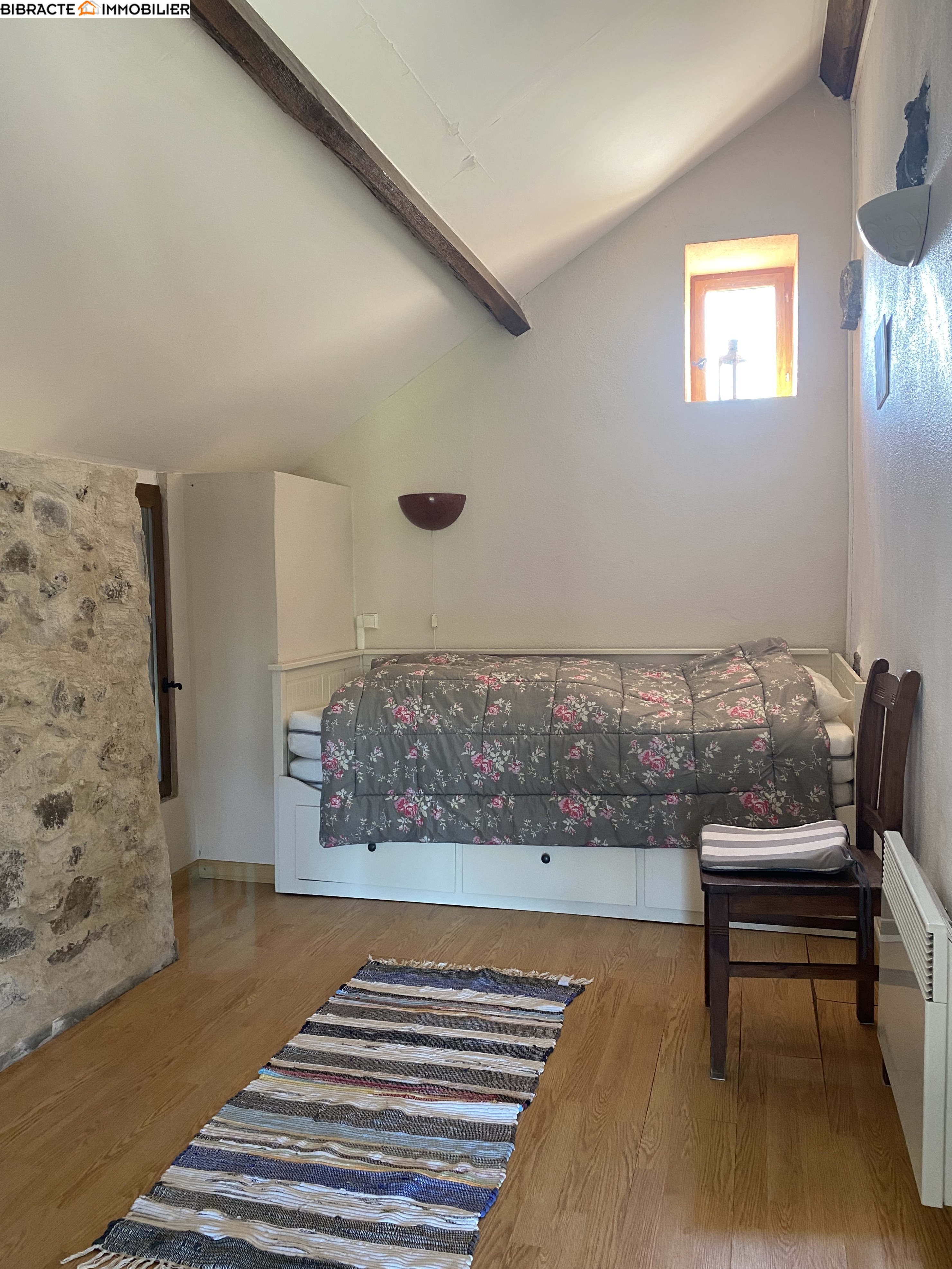 La petite maison a une surface habitable d'environ 90 m². Au rez-de-chaussée, elle se compose d'un séjour avec poêle à bois, d'une cuisine entièrement équipée, d'une chambre et d'une salle de bains avec douche, baignoire et WC. Le premier étage abrite une chambre spacieuse. Il y a également une cave, un abri à bois et une terrasse couverte. Le chauffage est assuré par un poêle à bois, complété par des convecteurs électriques.