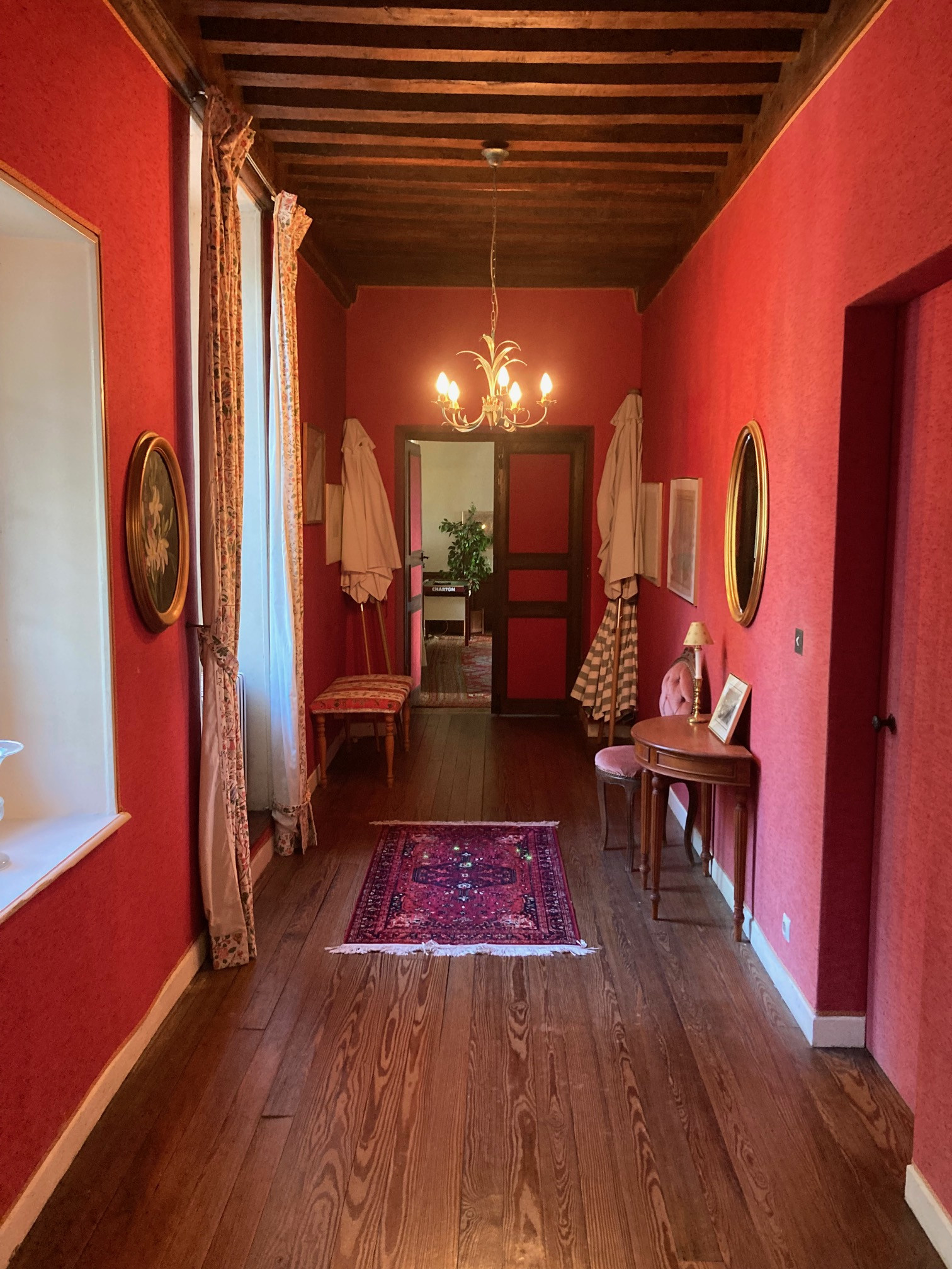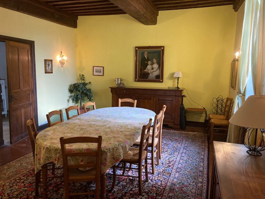 Sur la gauche, un couloir dessert une salle de séjour de 40 m2 avec boiseries, plafond à la française, cheminée et carrelage ancien au sol. La salle à manger de 24 m2, également avec plafond à la française et tomettes donne sur une cuisine équipée de 11 m2.